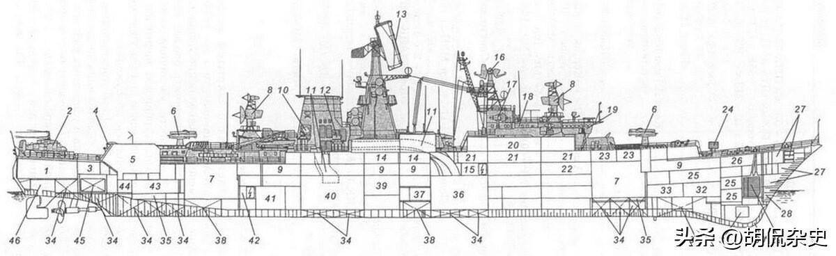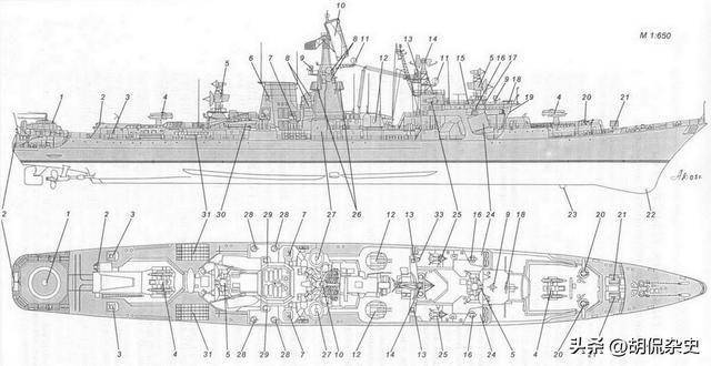 32 – “Vega”声呐天线 – “Shlyuz”导航系统天线)*:实际上,“Ring”电子对抗系统仅在一艘——“刻赤”号——在现代化过程中安装。