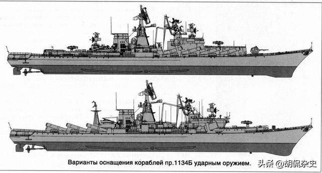 另一方案计划将1134-B型舰与1155型大型反潜舰统一,增强作战能力。原“暴风雪”发射装置拆除,改装“匕首”防空导弹(舰首和舰尾各4座8导弹发射装置,共64枚导弹)。原76毫米舰炮换装四座四筒“乌兰”反舰导弹发射装置。两座100毫米AK-100炮沿舰首半甲板线性安装在原“暴风雪”位置。反潜导弹系统“暴风雪”改为URK“Rastrub”,直升机机库扩大,可容纳两架Ka-27直升机。但因造价过高,该方案亦未实施。