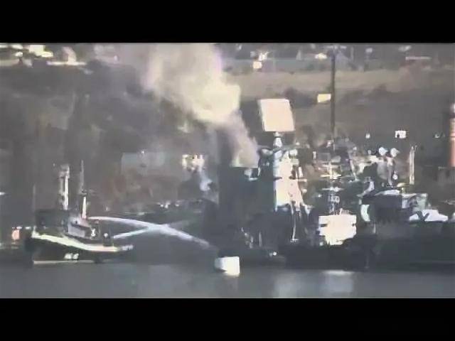 苏联“卡拉”级导弹巡洋舰尼古拉耶夫号(NIKOLAYEV)在与“卡辛”级导弹驱逐舰斯特罗吉号(STROGIY)相撞后,右舷中部受损的港舷视角。
