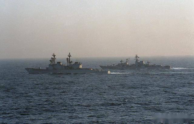 苏联“卡辛”级驱逐舰“坚毅号” (Решительный)在1979-1980年部署期间,从舰艏视角拍摄的其经过美国航母“珊瑚海号”(CV-43)时的画面。